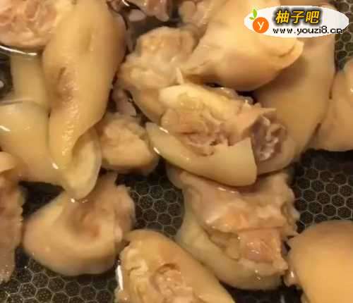 准备猪脚两只,剁大块,冷水下锅,放料酒煮出血末。