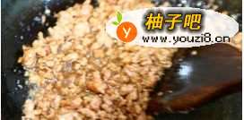 4锅底放适量植物油 油低温的时候就把肉末放进去煸炒 加少许老抽调色
