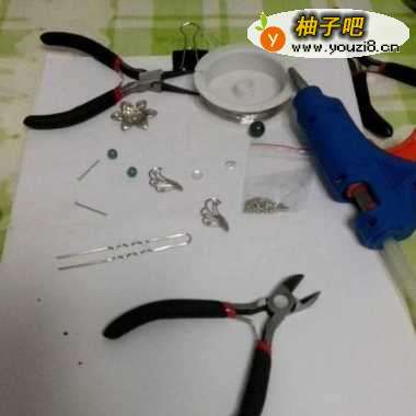 准备材料,先剪一段铜丝穿过珠子绑到花上 再用热熔胶固定一下。