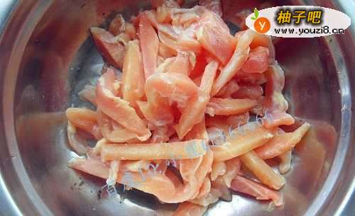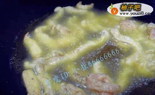 5锅里倒入适量的花生油烧开,将鸡柳放进锅里。