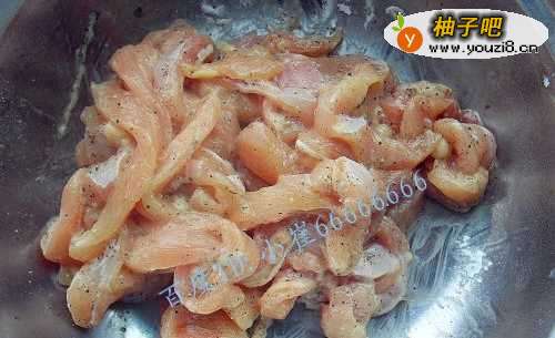 3鸡肉条里加入适量的盐,黑胡椒,淀粉抓匀,腌10分钟。