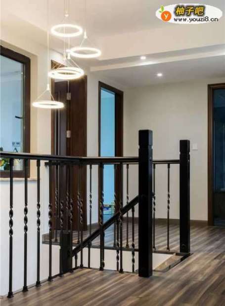 8现在把视线从楼下转到楼上,楼梯口处这个带有金色光晕的吊灯,柔和的光芒为楼梯间增添了光泽和奢华,丰富了空间氛围又充满着时尚感。
