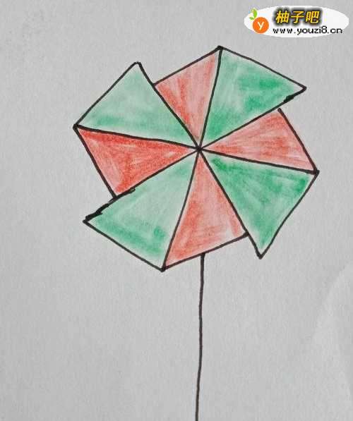 7最后给大风车涂上漂亮的颜色就可以啦。
