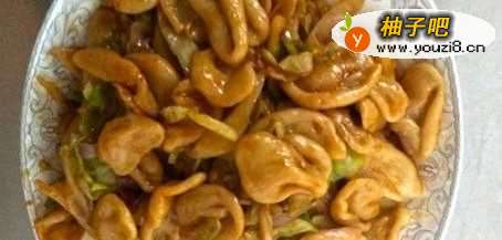 3开水煮猫耳朵,熟后过凉水控干备用。为防止粘连,可适当放点食用油拌一下。