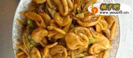 6依次放炒洋葱丝、圆包菜丝、猫耳朵炒匀,加白糖,精盐。