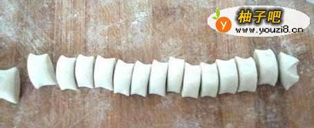 2制作耳朵:将面搓成像拇指粗细一样的长条,切成1公分宽的小面块,用大拇指在面板上摁住小面块朝前上方用力一搓便成,如图。