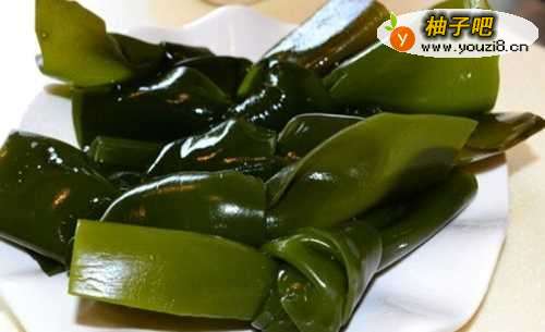 将海带浸泡后,放笼屉内蒸约半小时,取出再用清水浸泡4小时,彻底泡发后,洗净控水,切成长方块。