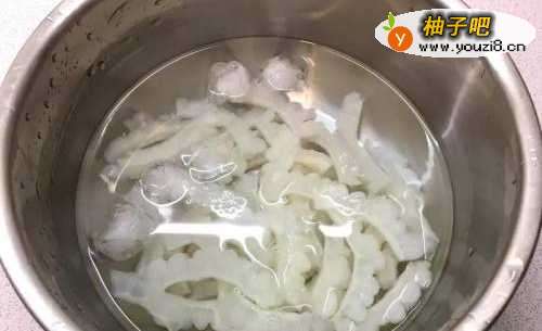2苦瓜去籽及白囊切片后入热水氽烫过,捞出入冰水中冰镇过后备用