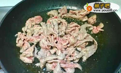 4开小火,牛肉入锅中倒入稍多的油中泡至约7分熟后捞出备用