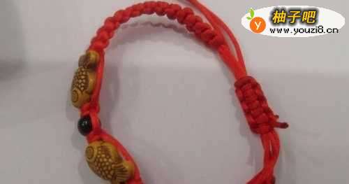2将丝线在手链上打一个结,以固定住丝线,打过结后,我们会发现线有三股了,分别是打结的丝线和手链的线,如图:以下我就用据手链线的左、右位置来讲解手链红绳怎么打结。