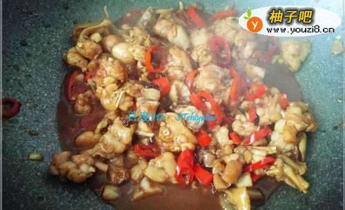5辣椒炒一阵后拨至两侧,将腌制的牛蛙块倒入,混合翻炒。