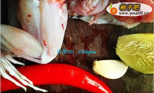 准备主要的食材:杀好的牛蛙、两根辣椒、少许生姜、蒜头等。