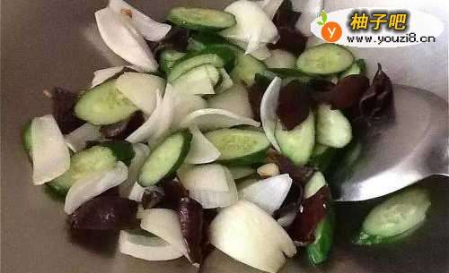 3炒锅放少许油,下蒜先爆香后,再放入洋葱、小黄瓜、木耳,拌炒至半熟。
