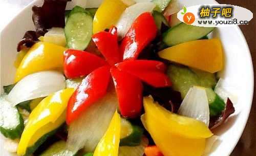4再放入红黄椒拌炒,下少许水,再拌炒,黄瓜与洋葱熟透,加少许盐调味即可。
