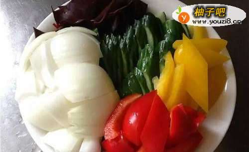 2洋葱去皮去头尾,彩椒去蒂去籽,小黄瓜去头尾,木耳去蒂,蒜去膜、头尾,并清洗干净,切片或菱形片。