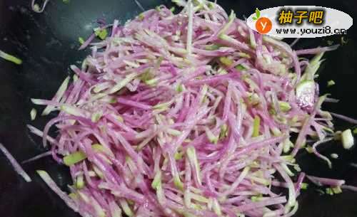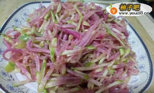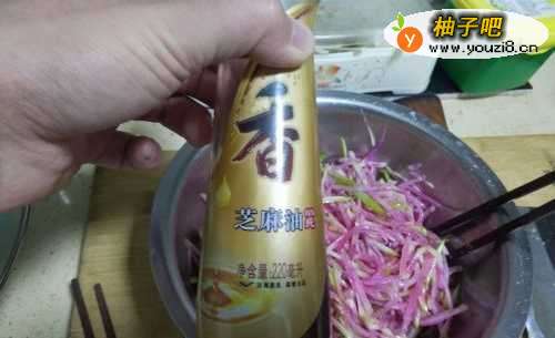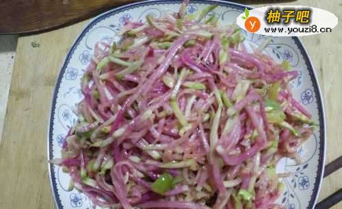 2用叉子插成细丝,撒点盐腌上2小时,倒掉里面的水分。