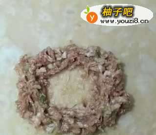 3把肉末摊开,中间空出来,弄出个圈的形状