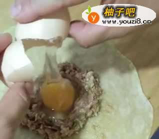 4哪一个鸡蛋,磕开,把鸡蛋放到肉中间的圆圈里面
