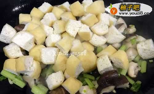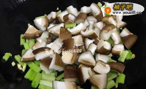 5芹菜炒几下之后,放入香菇一起炒1分钟。