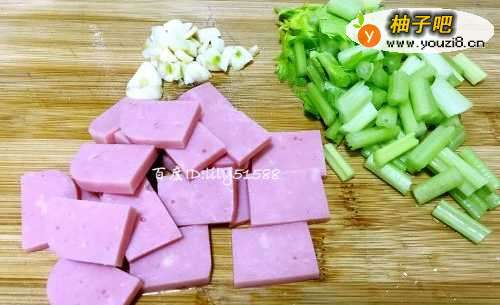 3将芹菜和蒜洗干净,把蒜切碎,芹菜切成小段,火腿肠切片。