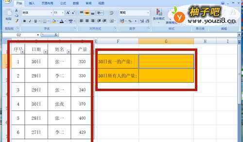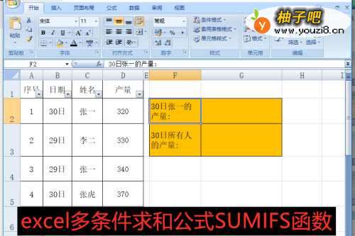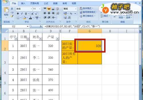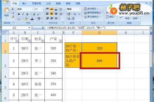 2在G2单元格中输入公式【=SUMIFS(D2:D7,B2:B7,"30日",C2:C7,"张一")】。