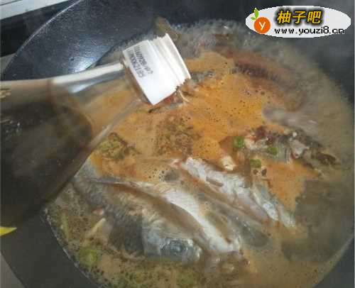 4鱼的第二面也煎得焦黄时,倒入半锅水,开大火煮鱼,鱼汤煮滚后倒入适量香醋。