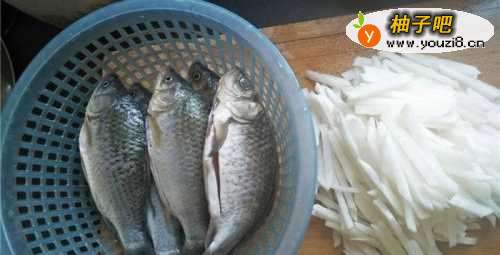 先将鲫鱼去鳞去鳃,清理内脏后,用水清洗干净并沥干;白萝卜切成丝备用;姜、蒜、青尖椒等去腥佐料切好备用。