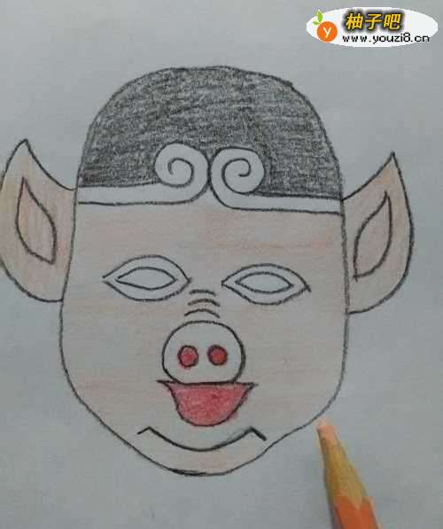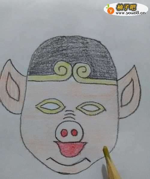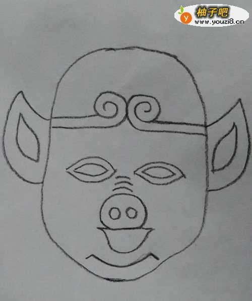 做猪八戒面具,先画出它的头部和帽子,然后将头部轮廓剪下来,再把眼睛中间剪下来,最后将纸条粘在头部两侧,面具就做好了。下面就来做猪八戒面具。