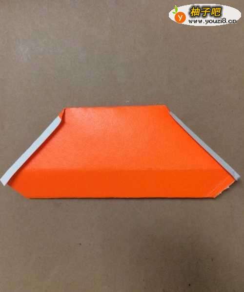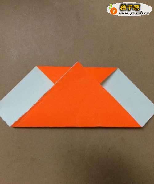 8沿着红白线交界处向内折叠。尾部向上翻折插进上面白色的三角里。