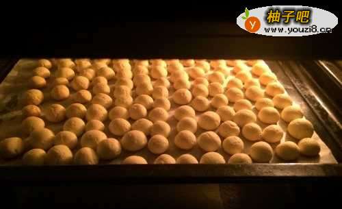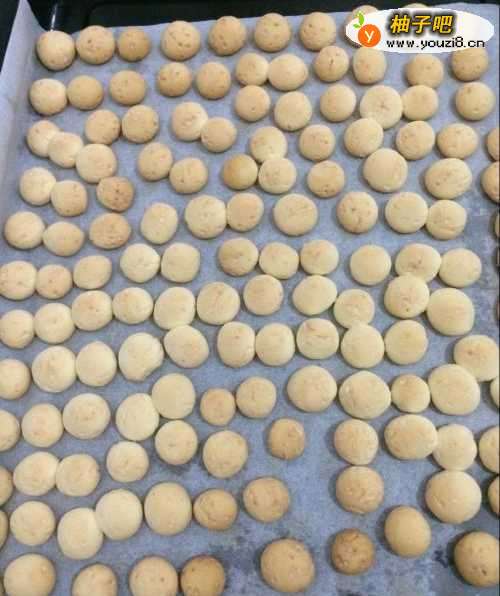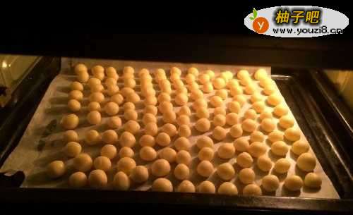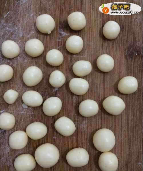 6接下来,把切好的小剂子,用手搓成小圆球。接下来烤盘里准备好油纸,把小圆球整齐排放在烤盘里。