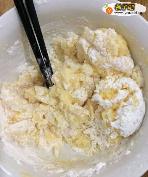 3接下来加入适量牛奶,搅拌成絮状。牛奶不要到太多,一点点就可以了。太稀不好揉成面团。