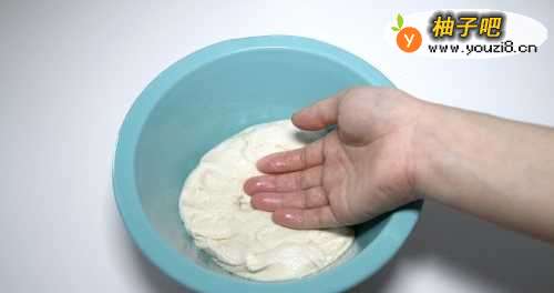 6待体积增大到1.5-2倍时,轻拍面团排气,露罩掩再盖上保鲜膜放进冰箱冷藏过夜。