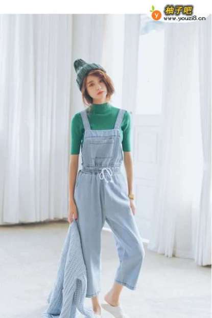4休闲浅色牛仔背带裤,非常的可爱的牛仔裤,随意的调节松紧的腰型设计,独特好看,阔腿裤的设计,修饰腿型,上身搭配的是简单高领薄款毛衣,青蓝色与浅色色彩非常的融合,清新舒适,十足的少女范。(这款搭配很适合腿粗的美眉)