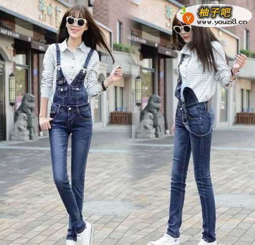 2紧身显瘦蓝色牛仔背带裤,立体的裁决技术,使女性的身体曲线看起来挺拔迷人,上身搭配的是一款白蓝色格子衬衫,白蓝色清新淡雅,与牛仔裤融为一体,瞬间提升整体气质,非常的吸引眼球。(这款十分的适合高挑的美眉,很显身材)