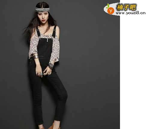 5紧身显瘦黑色牛仔背带裤,很简约的设计,上衣搭配是雪纺衫,花纹的图案和露肩的设计给整体增加了亮点,变得十分的性感和时尚,非常的吸引眼球。
