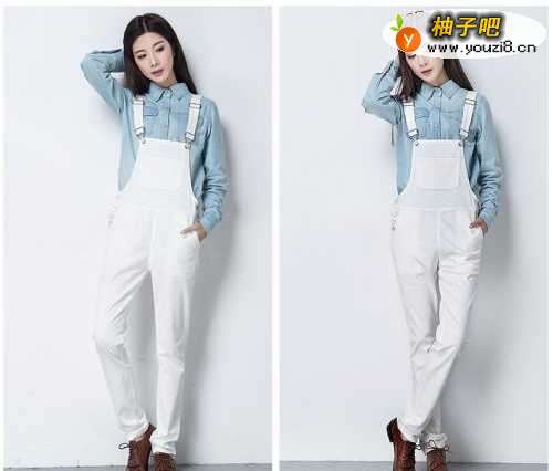 3白色牛仔裤背带裤,很简约的设计款式,上衣搭配的是蓝色牛仔衬衣,白色搭配蓝色经典时尚的色彩搭配,清新脱俗,给人非常舒适的感觉,很有文艺范。(浅色牛仔裤搭配浅色上衣最好看)