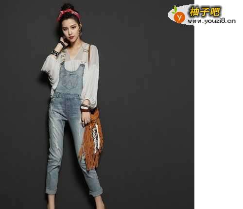 休闲水洗牛仔背带裤,经典的水洗磨破工艺,时尚前卫,上身搭配的是一款雪纺衫,舒适不束缚,V领的设计更展露出迷人的锁骨线条,十分性感。整体看上去休闲自在,十分的俏皮。