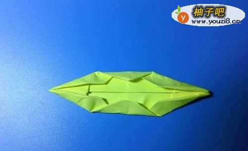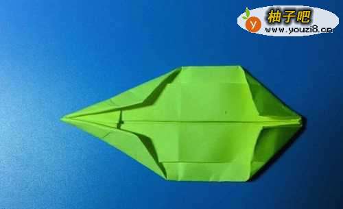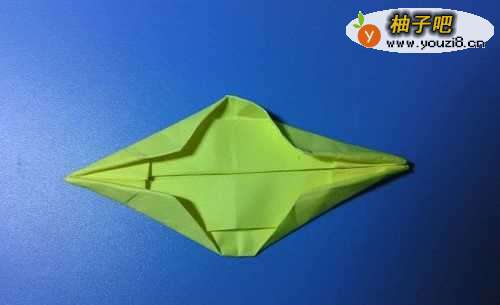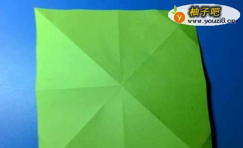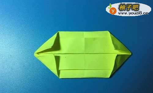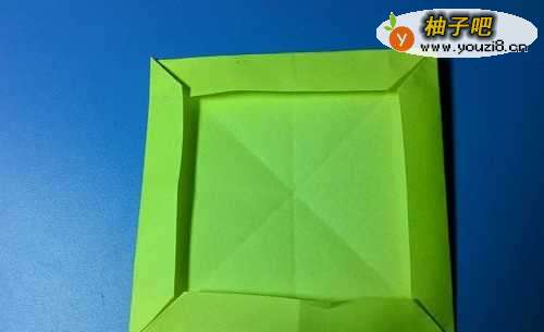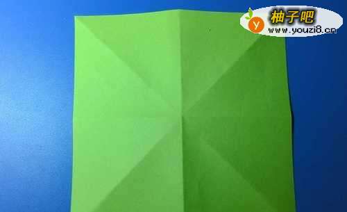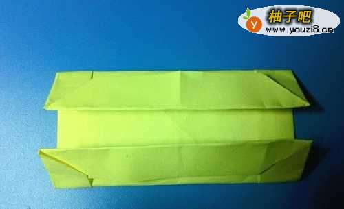 6长方形左边的两角沿中心线对折,折出两个三角形。右边与左边一样。如图