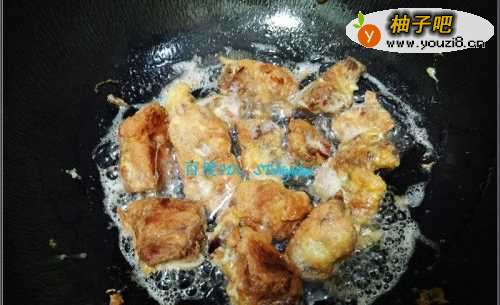 5将粘料的排骨放入油锅中炸一会,然后捞出,重新放入鸡蛋液中粘料,如此反复。
