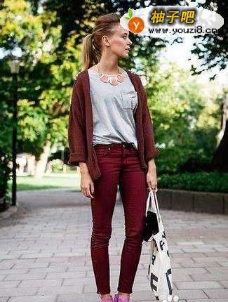 肩膀的柳釘令毛衣外套更具特色,可以搭配与外套颜色相当的深红色打底裤。
