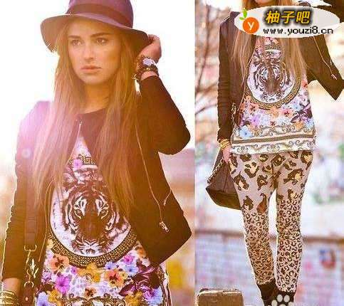 2黑色夹克短款外套 + 野性狮子打底衫 + 豹纹印花打底裤