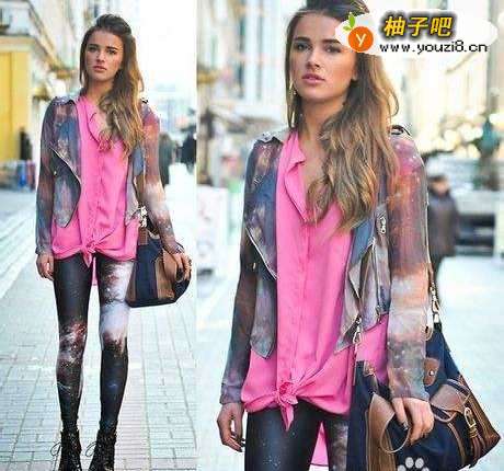 鲜红色的打底衬衫与宇宙印花图案的小外套搭配,颜色鲜亮分明眼前一亮。
