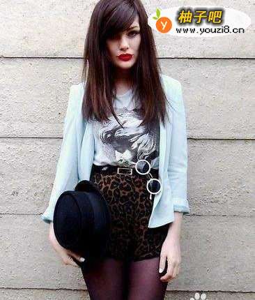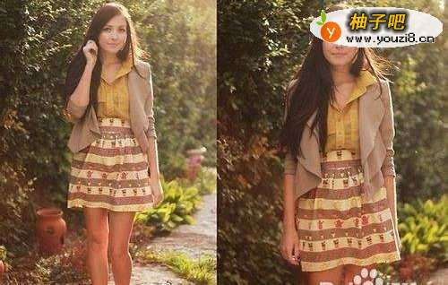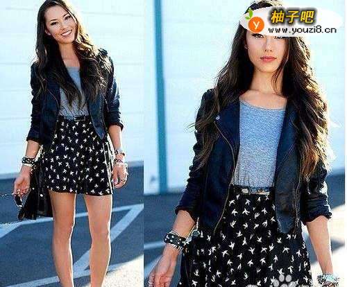 短款的小外套再搭配高腰的印花短裙是可以把整体的视觉效果拉伸,尽显身材。