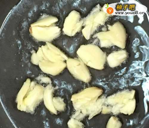 3炒锅烧热,倒入花生油烧热,放入蒜炒香。