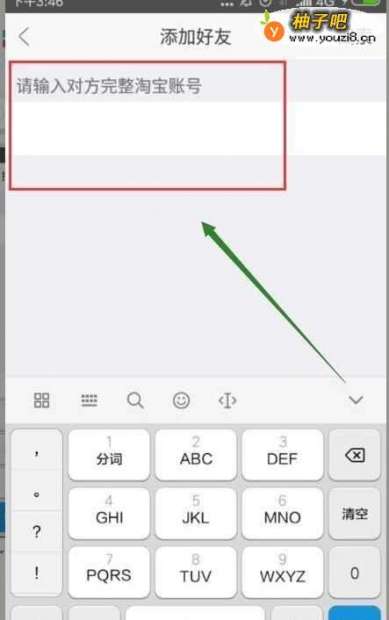 2点击后打开如下窗口,在此窗口中会有一个提示”请输入对方完整淘宝帐号“框,直接输入淘宝帐号进行输入并添加操作。