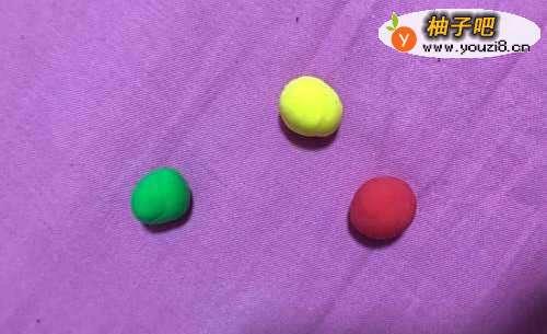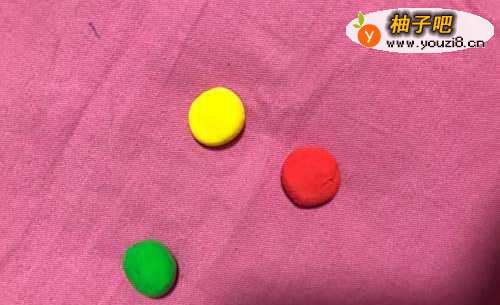 3在拿出红色的彩泥揉成圆形按扁,在拿出绿色的彩泥揉成圆形按扁。