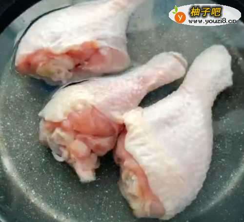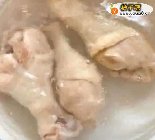 鸡腿清洗干净,凉水下锅,加入料酒、姜葱,水开后转小火煮15分钟。