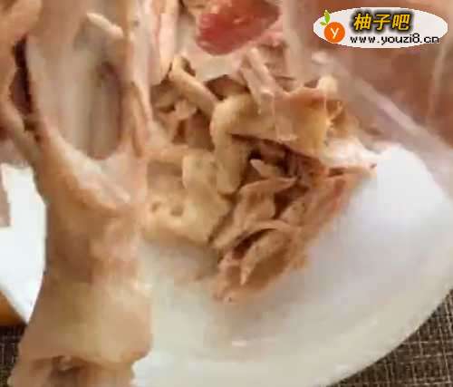 6把酱料汁倒入撕好的鸡腿肉上,抓匀即可。