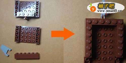 3接着,拼装帆船模型的船尾底座的支架部分。由四个底座积木和一些零件积木所组成。左边是拼装所需的零件,右边是拼装好后的整体结构效果,如下图所示。