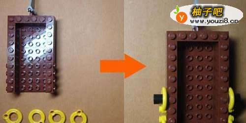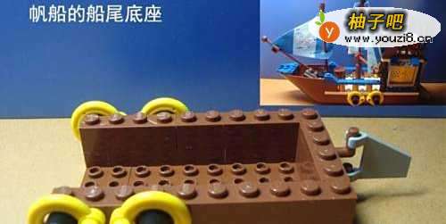 5接着,拼装帆船模型的船尾底座上游泳圈部分。由一些零件积木所组成。左边是拼装所需的零件,右边是拼装好后的整体结构效果,如下图所示。